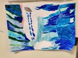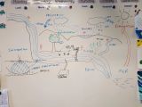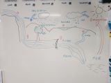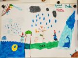 Cette matinée, essentiellement dédiée au cycle de l'eau, a débuté par un dessin coopératif des représentations des enfants par groupe puis ils ont réalisé diverses expériences : évaporation, infiltration de l'eau selon les sols, eau potable ou non (avec l'expérience de l'encre bleue dissoute par leau bouillante mais qui réapparaît avec du vinaigre)...